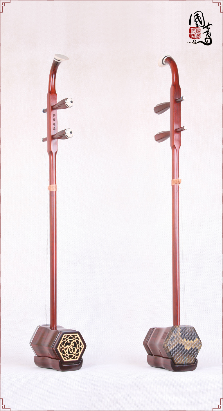 产品说明紫檀的材质致密坚硬,鬃眼细密,所制二胡发音亮丽。国音紫檀双声道精品二胡,经鉴定琴筒内的声音经过两次循环迂回传出,改变传统二胡直接发声的方式,因此琴皮与琴身共振协调,上下把位通透,内外弦平衡,无狼音、杂音,低音浑厚浓郁,高音清晰明亮,共鸣增大,音量增大,音色浑厚、圆润、优美,穿透力大,立体感强,演奏手感好,南北风格兼容,极大提高二胡的音质和丰富了音色。
